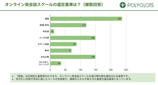 ・オンライン英会話スクールを選ぶ際、最も重視される要素は「価格」(73%)であり、
