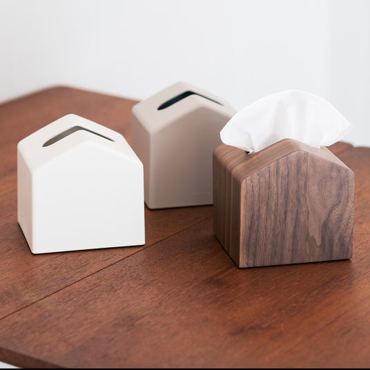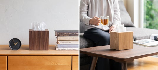 今回の「クラスタ コンパクトティッシュケース」は、シンプルなスクエア型のデザインで、落ち着いたウォルナット色と、明るいナチュラル色の2色をご用意。家具との調和もよく、ティッシュボックスをそのまま置くのは抵抗があるリビングやダイニング、ベッドサイドなどにもぴったり。生活感を感じさせず、さまざまなシーンでお使いいただけます。
