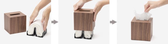 【簡単に詰め替えられる】 一般的なサイズのティッシュペーパーを箱から出し、二つ折りにして乗せ、上から本体を被せるだけ。 力をかけなくてもカチッと固定。分かりやすい動作で簡単に詰め替えが出来るように工夫しました。