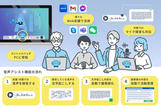 本機能は、Web会議等の音声をAIコンシェルジュアプリが録音/解析し、テキストデータに変換したうえでeセールスマネージャーに活動記録を自動で登録します。これにより、CRM/SFAに都度情報を入力する業務負担からユーザーを開放します。