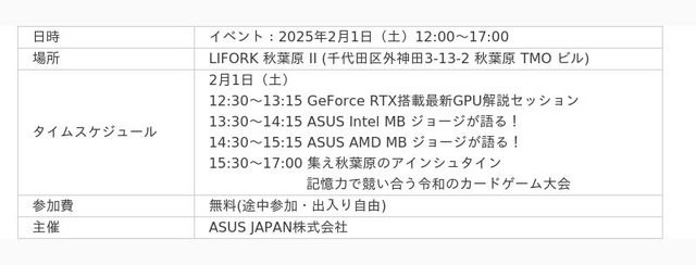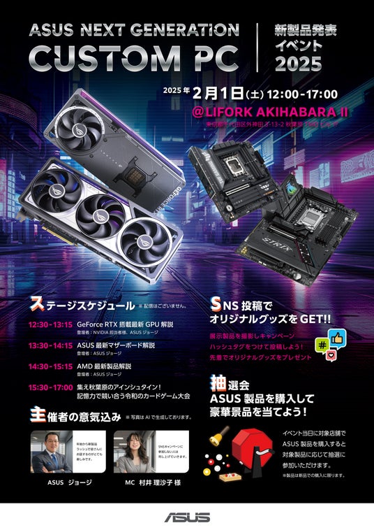 ASUS JAPAN株式会社 は、2025年2月1日(土)にLIFORK AKIHABARA II にてNVIDIA(R) GeForce RTX(TM) 50シリーズをはじめ、インテルやAMDの新CPU対応マザーボードを含むその他新製品を知って体験できるイベントを実施します。また、イベント当日限定で豪華賞品が当たる抽選会を実施しますので、ASUS製品のご購入を検討されている方はこの機会をお見逃しなく。