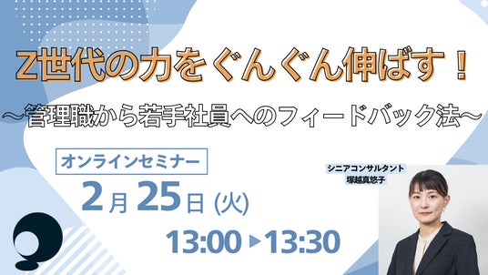 組織・人事コンサルティングファームであるセレクションアンドバリエーション株式会社(以下、当社、東京都千代田区丸の内、大阪市西区、名古屋市西区 / 代表取締役社長:平康慶浩/ URL:https://sele-vari.co.jp/ )は「Z世代の力をぐんぐん伸ばす!~管理職から若手社員へのフィードバック法~」セミナーを2025年2月25日(火)13:00~13:30に開催することをお知らせいたします。