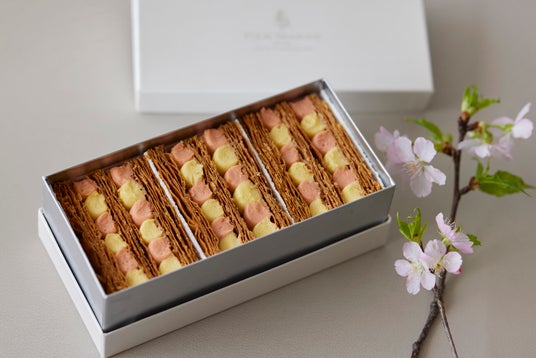 総料理長 ダニエル・カルバートのシグネチャーである、繊細な層が幾重にも重なるパイ生地が人気のミルフィーユ。3月1日(土)からの季節のミルフィーユは、桜 ミルフィーユ。サクサクのパイ生地に、桜のディプロマットクリーム、桜葉とバニラのディプロマットクリームを交互に絞りクラシックなスタイルに。メレンゲの上に、さくらパウダーのアクセントで仕上げています。