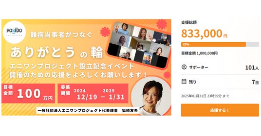 難病当事者3名により「病気のある人もない人も当たり前に生きられる世の中に」を掲げ2024年11月に設立した一般社団法人エニワンプロジェクト(本社:東京都練馬区、代表理事:狐崎友希)が、活動の第一歩として設立記念イベント【ありがとうを伝える会】2025年3月8日(土)〈都内会場とオンラインのハイブリッド形式〉の開催に向けてクラウドファンディングを実施しています。
