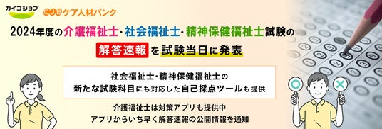 株式会社エス・エム・エス(本社:東京都港区、代表取締役社長:後藤夏樹、東証プライム、以下「当社」)は、介護職向け求人情報サイト「カイゴジョブ」(URL:https://www.kaigojob.com/)、並びにケアマネジャー・相談員向け人材紹介「ケア人材バンク」(URL:https://www.carejinzaibank.com/)を提供しており、2025年1月26日(日)に行われる「第37回介護福祉士国家試験」、同2月2日(日)に行われる「第37回社会福祉士国家試験」および、同2月1日(土)・2日(日)に行われる「第27回精神保健福祉士国家試験」の解答速報をそれぞれのサービスサイトにて試験当日に公開します。受験者は事前登録を行うことで、解答速報発表の通知を受け取ることが可能です。