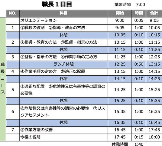 建設業、製造業(一部除く)、電気、ガス、機械修理業、自動車整備業、食料品製造業(うまみ調味料製造業及び動植物油脂製造業は、すでに対象)」、「新聞業、出版業、製本業及び印刷物加工業」など教育が必要な業種の選任される予定の方対象と、安全衛生責任者の選任される予定の方対象に、必要な知識と実務能力を習得していただくため、学科14時間のカリキュラムによる講習です。