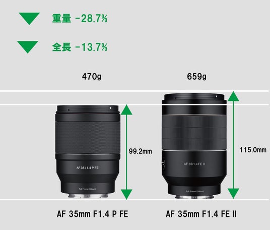 従来機種(SAMYANG AF 35mm F1.4 FE II)と比較しても、約30%の軽量化に成功。