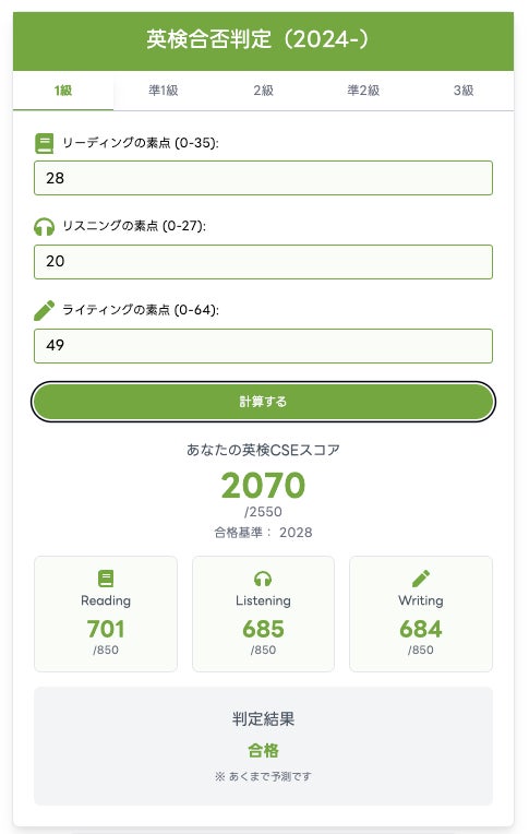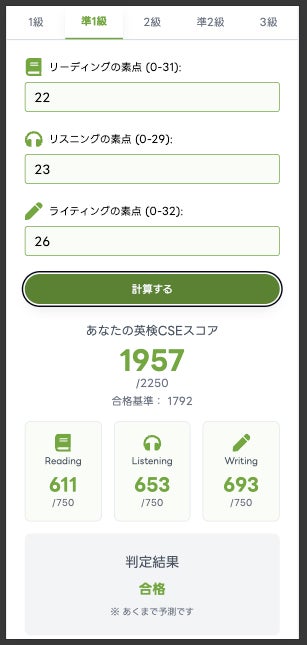 リーディング・リスニング・ライティングの素点を入力すると、CSEスコアと合格ラインを比較し、合否目安を表示します。