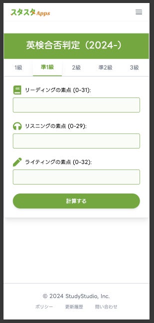 スタディスタジオ株式会社(本社:東京都渋谷区、代表取締役:鈴木孝一、以下「当社」)は、2024年度第3回実用英語技能検定の解答速報が1月27日(月)13:00以降に公開されるのにあわせ、英検(R)1級・準1級・2級・準2級・3級それぞれの素点(リーディング・リスニング・ライティング)を入力することで、CSEスコアから合否を推定できる「合否判定ツール」を無償提供いたします。さらに、自己採点が難しいライティング問題については、AIによる自動採点ツールもあわせて公開中です。