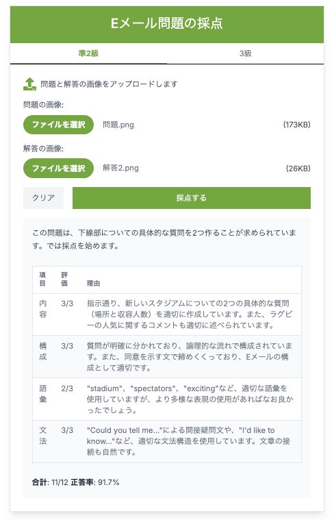 意見論述問題/Eメール問題/要約問題の3種類を順次公開中。問題・解答を画像アップロードするだけで、内容・構成・語彙・文法の観点からAIが評価。