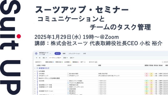 株式会社スーツ(所在地:東京都千代田区、代表取締役社長CEO:小松 裕介)は、2025年1月29日(水)19時から、当社代表の小松が講師を務めるスーツアップ・セミナー「コミュニケーションとチームのタスク管理」を無料開催します。
