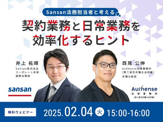 2025年2月4日(火)に開催するウェビナー「Sansan法務担当者と考える 契約業務と日常業務を効率化するヒント」では、企業の「法務担当者」の皆さまにフォーカスし、人手不足や業務過多をどのように解決すればよいのか、ツールと人材の両面からお困りごとの解決策をご提案します。