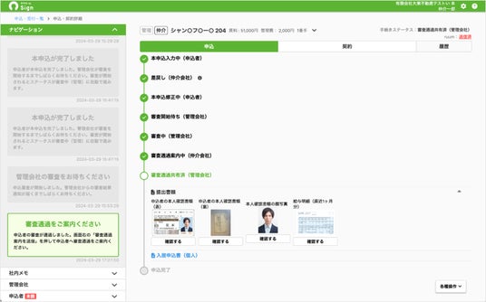 - 初見でも直感的でわかりやすいデザイン設計。お部屋を借りる方、お部屋のオーナー様、仲介会社様、管理会社様など多くの関係者が関わる賃貸取引の申込/契約で現在の対応状況など、次のアクションが一目でわかるナビゲーション機能や同一画面で関係者とチャットができる機能を搭載