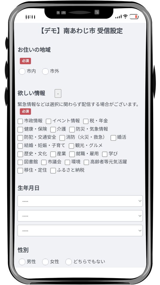 受信設定市政情報、イベント情報から結婚・妊娠・子育て、災害情報など、ユーザーが自分で受け取る情報を選択します。受信設定で選んだ情報が自動で届くようになります。