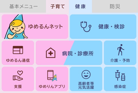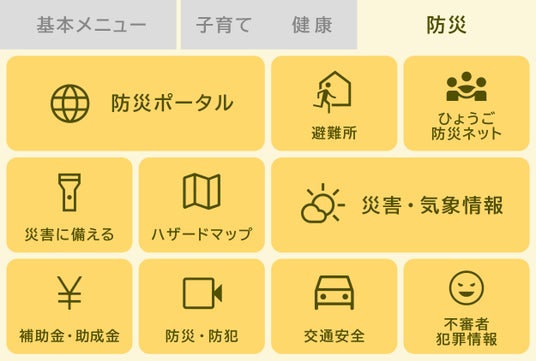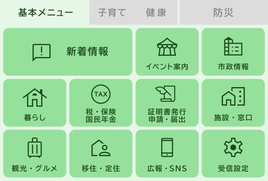 基本メニュー、子育て・健康、防災の3つのカテゴリーに分類し、情報をわかりやすく配置しています