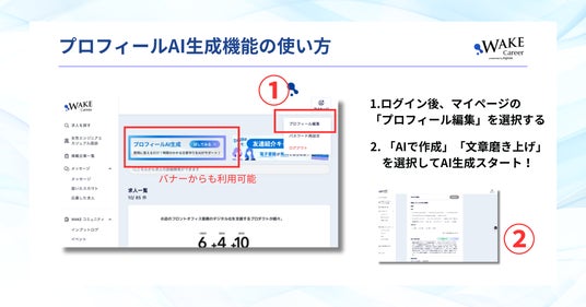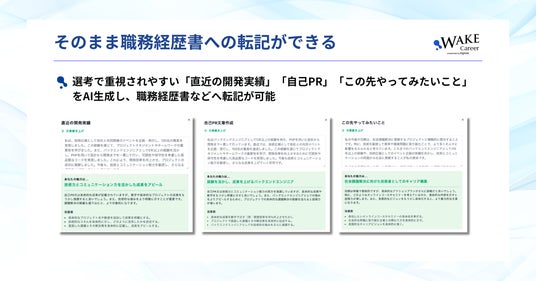 この新機能では、すでにWAKE Careerに登録しているプロフィールからAIが個々の経験やスキルを分析し、効果的な自己PR文を生成します。これにより、女性エンジニアは、自信の経験やスキルを自信を持ってアピールできるようになります。