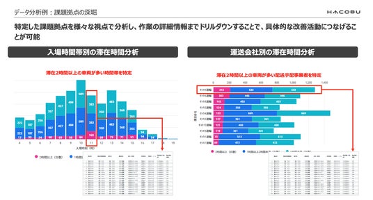 車両の滞在時間や荷待ち時間が長いなどの課題を迅速に特定・原因分析できる機能を備えています。課題が発生した際、詳細データに即座にアクセス可能となり、問題の発生源を特定して迅速な解決策を導き出せます。この効率化により、課題解決までの時間を短縮します。