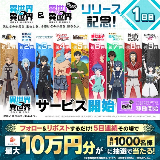 株式会社コロプラ(代表取締役社長 上席執行役員 CEO:宮本貴志、本社:東京都港区、以下「コロプラ」)は、スマートフォン&PCに向けた新しいエンターテインメントサービスとして、『異世界∞異世界』(いせかいいせかい)と『異世界∞異世界BBS』(いせかいいせかいびーびーえす)のサービスを本日2025年1月27日(月)より開始したことをお知らせいたします。また、本日より「無職転生II ~異世界行ったら本気だす~」が登場しております。
