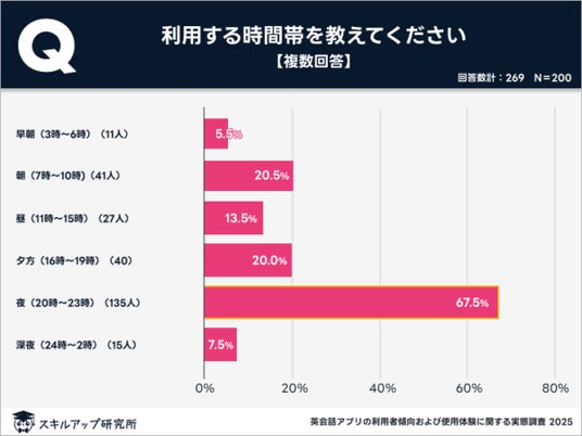 英会話アプリの利用時間帯を尋ねたところ、夜20時~23時に利用する人が多いことがわかった。