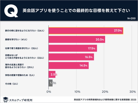 英会話アプリ利用者の目標を尋ねたところ、回答が分散した。最多となったのは「旅行の時に話せるようになりたい」で、全体の27.0%が回答したが、「基礎を学びたい」「仕事で使う英語を学びたい」などにも回答が集まった。
