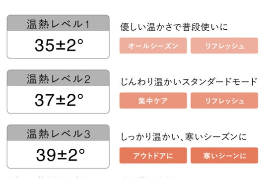 穏やかな温かさで普段使いにぴったりの設定から、寒い季節でもしっかりと温もりを感じられる高めの温度設定まで、幅広いシーンや季節に応じて快適にご利用いただけます。温かさは、お風呂の湯加減と同じように、人それぞれが心地よいと感じる温度が異なります。その日の気分や体調に合わせて、3段階の温度設定からお好みの温かさをお選びください。