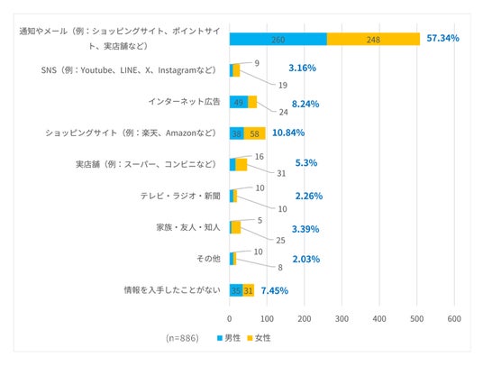 お得なキャンペーン情報の入手先を調査した結果、最も多かったのは「通知やメール」で、全体の57.3%を占めました。特にショッピングサイトや実店舗からの通知が役立っているようです。次いで「ショッピングサイト」(10.8%)を利用する人が多い一方、「SNS」(3.2%)や「インターネット広告」(8.2%)は少数派でした。また、「情報を入手したことがない」と答えた人も7.4%おり、情報収集に積極的でない層が一定数いることがわかります。この結果から、シニア層への情報発信にはメールや通知が効果的ですが、SNSや広告を組み合わせることで、より幅広い層へのリーチが期待できる可能性があります。