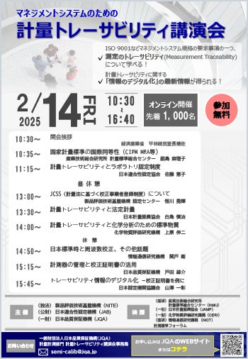 一般財団法人日本品質保証機構(本部:東京都千代田区、理事長:石井 裕晶)計量計測部門は、独立行政法人 製品評価技術基盤機構(NITE)および公益財団法人日本適合性認定協会(JAB)との共催による無料WEB講演会「2024年度マネジメントシステムのための計量トレーサビリティ講演会」を、2025年2月14日(金)に開催いたします。