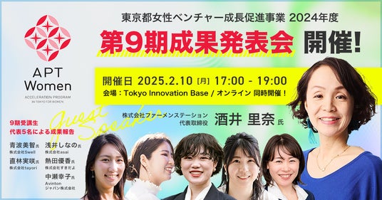 東京都女性ベンチャー成長促進事業「APT Women(読み:アプト ウィメン、Acceleration Program in Tokyo for Womenの略)」は、東京都を起点に世界での活躍を目指す女性起業家と、彼女たちが世に届ける製品とサービスに触れていただくイベントとして、2025年2月10日(月)に「成果報告会」、2月19日(水)に「ピッチイベント」を、東京都千代田区の会場で開催します。