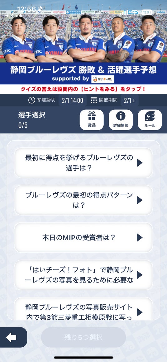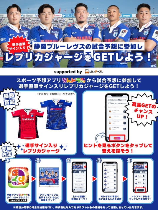 イノベーションの力で新たなスポーツ・エンターテインメントを創造し、まだ見ぬ感動と熱狂を提供するアプリ「なんドラ」を運営する株式会社なんでもドラフト(本社:東京都渋谷区、代表:森井啓允)は、2月1日(土)にヤマハスタジアムで行われるNTTジャパンラグビー リーグワン 2024-25 ディビジョン1 第6節 静岡ブルーレヴズ 対 東京サントリーサンゴリアスを対象とした、試合展開・活躍選手予想(協賛:はいチーズ!)を開催します。
