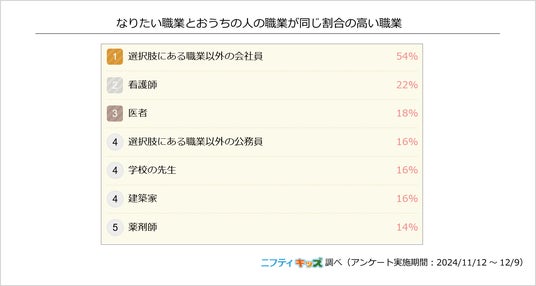 また、子どもたちの将来なりたい職業とおうちの人の職業を照らし合わせると、会社員の親を持つ子どもたちは54%の人がおうちの人と同じ会社員になりたいと考えていることがわかりました。