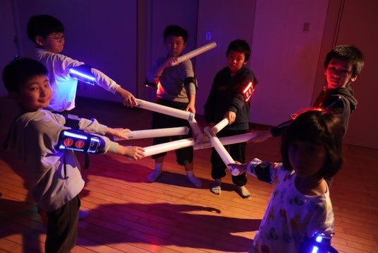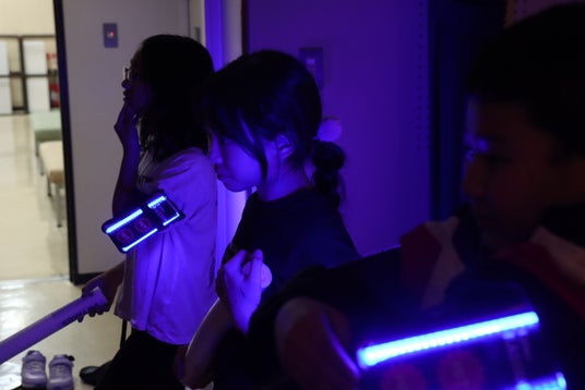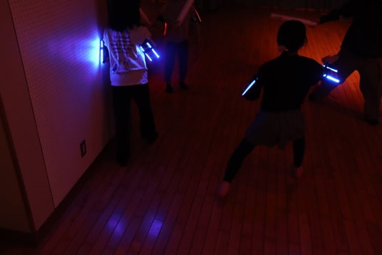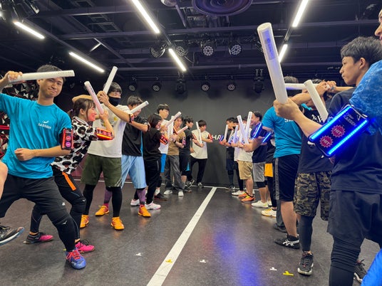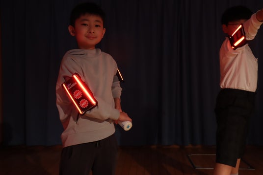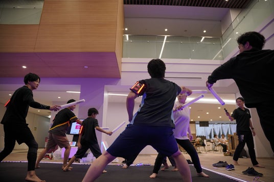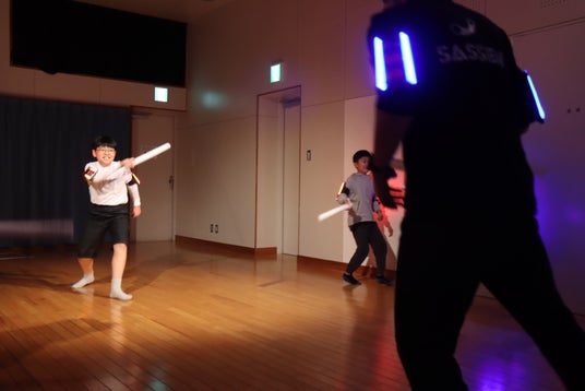 Cyber KASSENは、腕にセンサー付きデバイスを装着し、柔らかい棒で戦う新感覚スポーツです。当日は、基本的に3対3のチーム戦形式で進行し、子どもたちはチームごとに力を合わせて試合に挑みました。