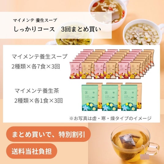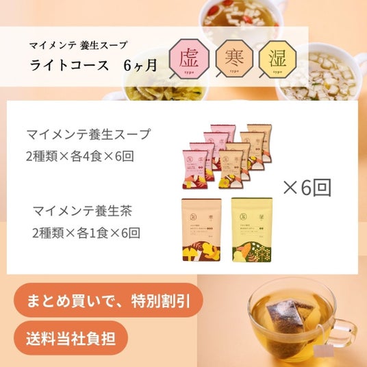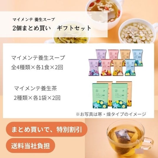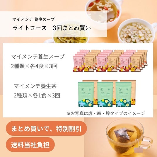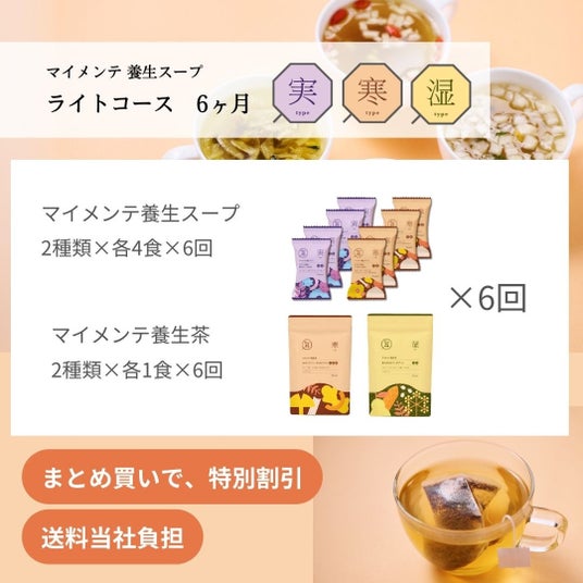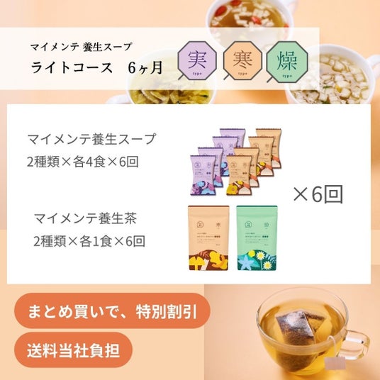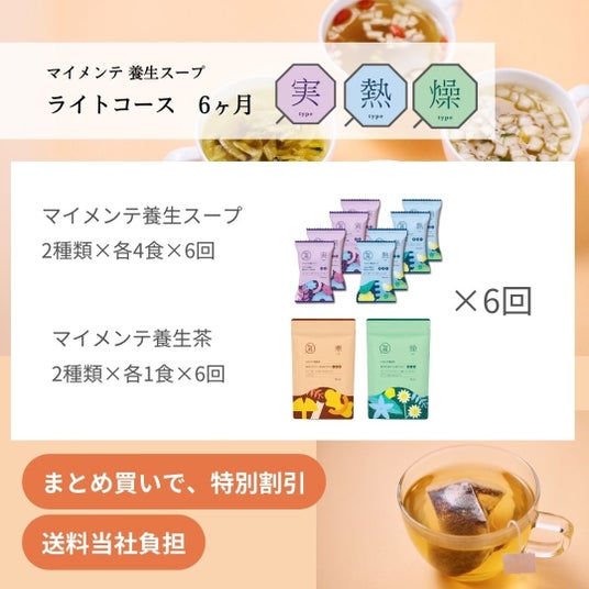 「Fun to Me」では、通常、「マイメンテ養生スープ」と「マイメンテ養生茶」、LINEでの健康アドバイスをセットで販売していますが、今回は、人気商品「マイメンテ養生スープ」の全4種をお試しいただける限定セットを展開します。また、サブスクリプションサービスで通常展開している「ライトコース」・「しっかりコース」が3回分まとめて届くサブスクまとめ買いセットや、ギフトセット2つが届くギフトまとめ買いセット、給与天引き決済サービス「給トク払い」のみで購入可能な、「ライトコース(サブスク)」 6ヶ月分など、幅広いニーズにお答えできるラインアップを揃えました。