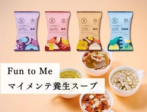 「マイメンテ養生スープ&養生茶」は、和漢植物などのさまざまな素材をブレンドした旨味たっぷりで低カロリーのフリーズドライスープと、ノンカフェイン※のティーバックタイプのお茶のセットです。寒く乾燥した日が増えるこれからの季節に、温かい水分補給と養生食で無理なく楽しく、年齢によるゆらぎに負けない毎日へ、Fun to Meがサポートします。