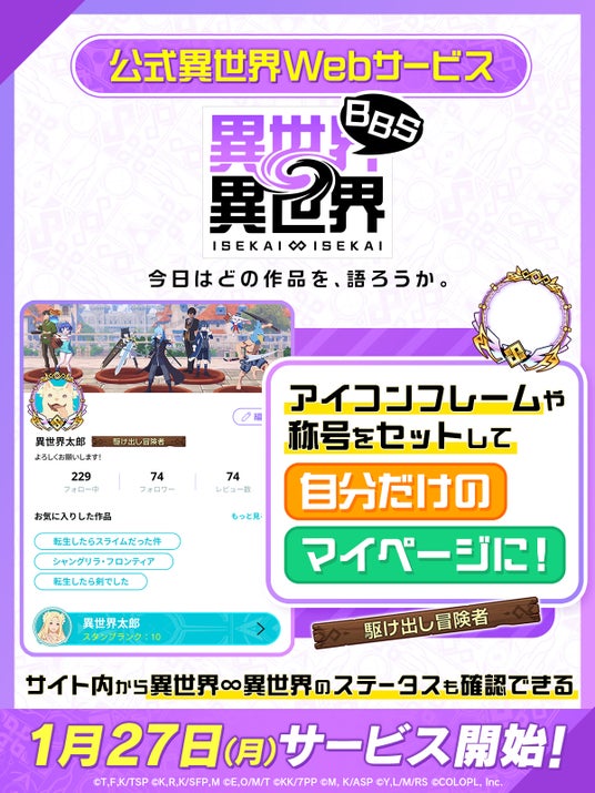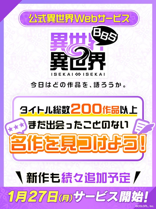 株式会社コロプラ(代表取締役社長 上席執行役員 CEO:宮本貴志、本社:東京都港区、以下「コロプラ」)は、公式異世界Webサービス『異世界∞異世界BBS』(いせかいいせかいびーびーえす)のサービスを本日2025年1月27日(月)に開始しております。