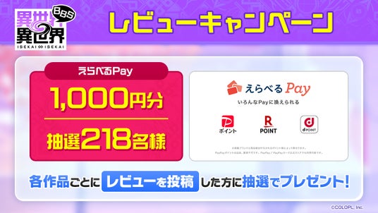 218タイトルある作品の中から好きな作品についてレビューしよう!各タイトルごと「いいね」の多いレビューの中から抽選で218名様に「えらべるPay(R)」1,000円分をプレゼント!