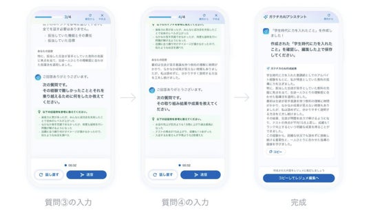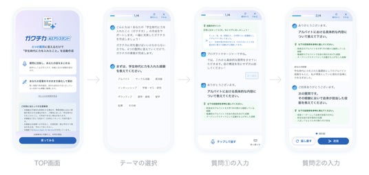 エントリーシートの記入項目あるいは面接で頻繁に質問される項目である、「学生時代に力を入れたこと(ガクチカ)」の素案を、生成AI(*3)が自動作成する機能です。4つの質問にチャット形式で回答することで、過去の経験に基づき、取り組んだことや成果を洗い出しながら自分の強みを理解し、言語化することができます。学生自身が就職活動を進めながら素案をブラッシュアップしていくことで、より自分らしいガクチカを作成することができます。