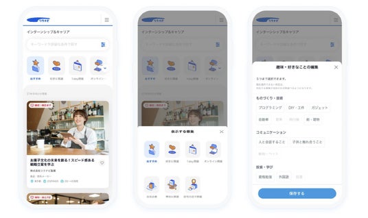 3.「好きに関連」…ものづくり・技術、カルチャー、コミュニケーション、投資・学び、スポーツ・レジャーの5つのカテゴリーに分かれた選択肢の中から、興味のあるものを最大で5つ選択でき、選択結果に基づいておすすめのコースを表示