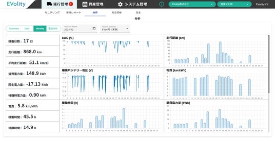 EVolityが提供するフリートマネジメントシステムは、パソナ日本総務部が運用するEVの運行管理をサポートします。同システムは、車両の電池残量や走行距離などを常時モニタリングし、CO2排出削減量や燃料費削減量を数値化することで、EV導入効果を可視化します。