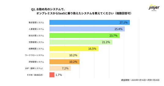 オンプレミスからSaaSに乗り換えたシステムで最も多いのは「勤怠管理システム(27.1%)」でした。次いで「人事管理システム(25.4%)」、「給与計算システム(23.7%)」という結果となりました。