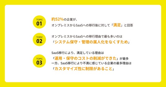 個人的には、SaaS導入後の満足度が全体の半数以上いることに、嬉しさを感じました。IT人材の不足やコスト削減という観点で、企業がより持続可能的にシステム運用するためには、SaaSが有効であると証明していることと同義だと感じたためです。