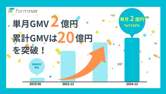 株式会社ベーシック(本社:東京都千代田区、代表取締役:秋山勝、以下「当社」)は、累計40万ユーザーが利用するフォーム作成管理ツール『formrun』の決済機能において、2024年12月時点で単月GMV(流通取引総額)が2億円を達成。取引総額は前年比で43%増加するなど順調な成長を続け、累計GMVも20億円に到達しました。