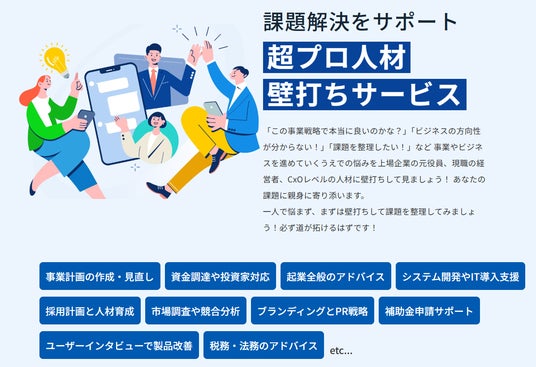 そのような背景から、ご自身の課題に類似した課題を解決した専門人材(=プロ人材)に直接相談を行い、必要情報を整理・ブラッシュアップし、客観的意見を得ることが出来、新たな知見を取得する仕組みが必要であると当社は考え、課題を解決へと導くプロ人材と壁打ちが出来る「壁打ちONE」をリリース致します。