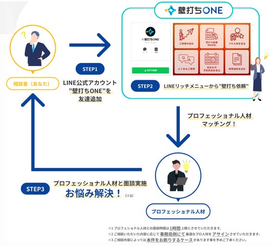 ご利用はLINE公式アカウントの「壁打ちONE」で友達追加から簡単ステップでプロ人材が解決!