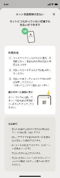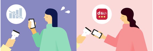 本機能により、地下などの電波が届きにくい場所や混雑している場所、通信障害時においても、「d払い(コード決済)」で決済用のバーコードやQRコード(R)を表示することができます。事前の設定は不要で、ネットワークに接続していない場合やネットワーク接続が不安定な場合に、自動的に本機能専用の支払い画面に切り替わります。お客さまが表示した支払い画面を、お店が読み取る方式の「d払い」加盟店でのみ利用可能です※2。