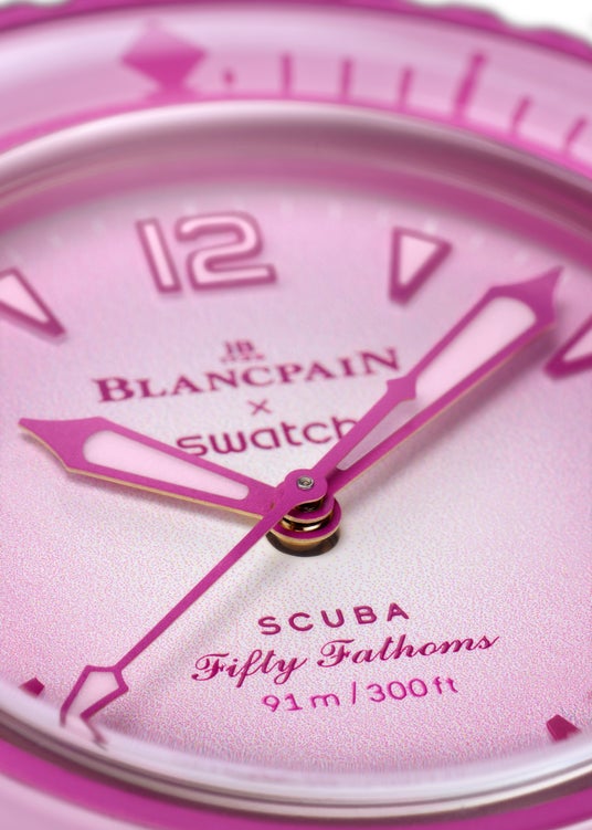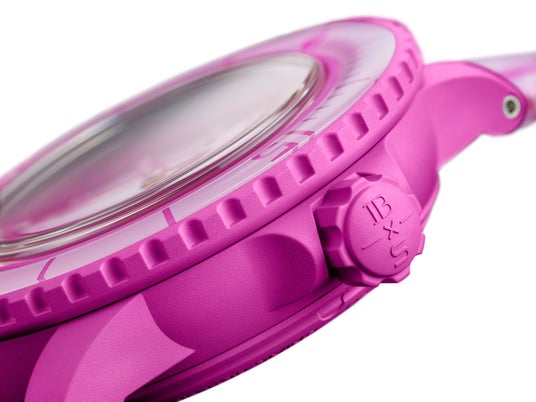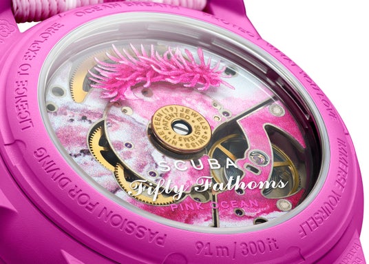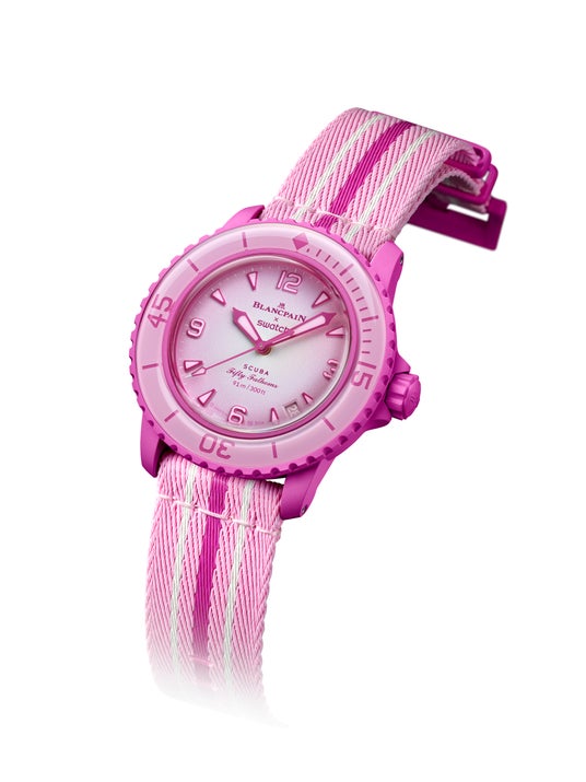 PINK OCEANはBioceramic Scuba Fifty Fathomsコレクションの最新作で、最初の本格的なダイバーズウォッチ、ブランパンのFifty Fathomsへのオマージュです。Swatchの特許取得済みBioceramic素材で作られたこの非限定モデルは、このコレクションのために特別に開発されたユニークなピンクカラーが特徴です。