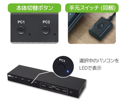 切替方法は、本体ボタンもしくは手元スイッチ(同梱)を押すだけ。それぞれのパソコンに周辺機器を用意する必要がなく、より広々とした操作環境が実現できます。