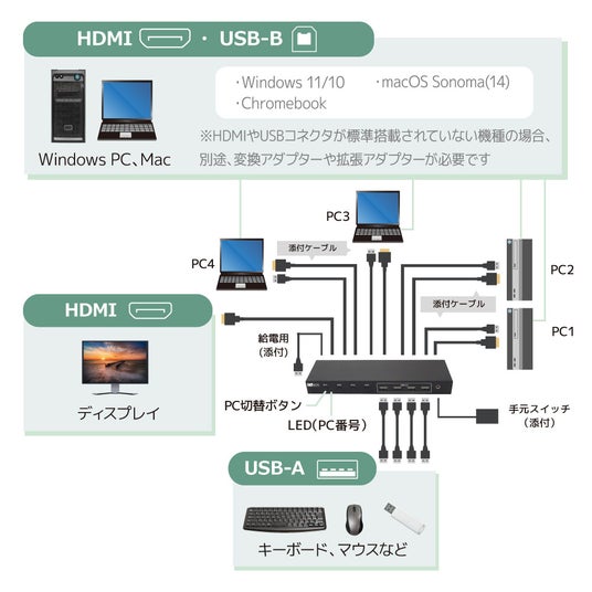 本製品はHDMI端子とUSB端子が搭載されたパソコンに対応。OSはWindows、Mac、Chromebookに対応しており、異なるOSのパソコン(例:WindowsとMac)でも切り替え可能です。