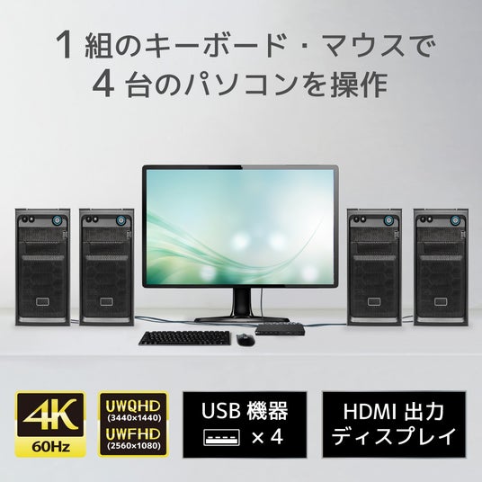 - キーボード・ディスプレイ・マウスを4台のパソコンで切り替えて快適操作