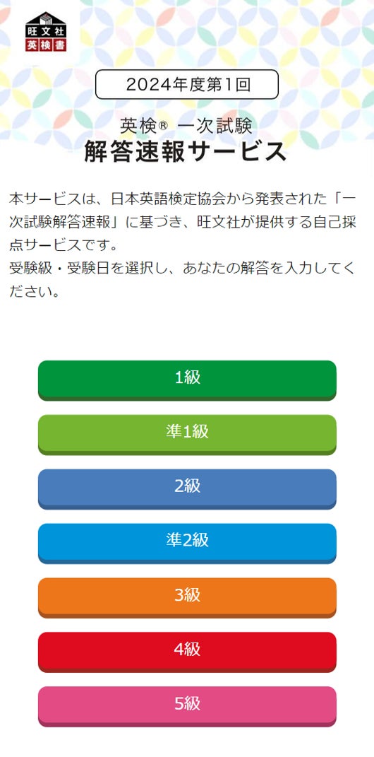 「英検(R)一次試験 解答速報サービス」は、公益財団法人 日本英語検定協会から発表された「一次試験解答速報」に基づき、旺文社が提供する無料の自己採点サービスです。