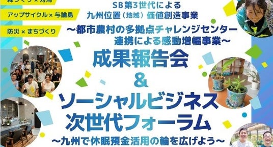 主催は九州のソーシャルビジネス創出、育成を支援している一般社団法人SINKa(本社:福岡市中央区 代表理事:濱砂清)で、地域課題の解決に取り組む団体や、それを支援している方々を対象に、休眠預金の活用事例を紹介し、九州で活用にチャレンジする輪を広げることを目的としたものです。第1部では、「都市農村の多拠点チャレンジセンター連携による感動増幅事業」をテーマに3年間にわたって推進してきた「SB第3世代による九州位置(地域)価値創造事業」の成果報告会を開催します。